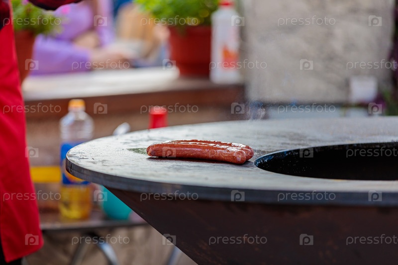Две сосиски разогреваются на круглой печи в уличном кафе