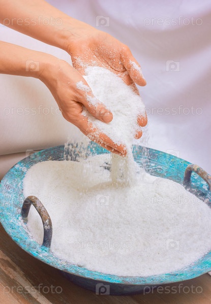 Женские руки насыпают морскую соль в синюю миску. Концепция ухода за кожей, исцеление