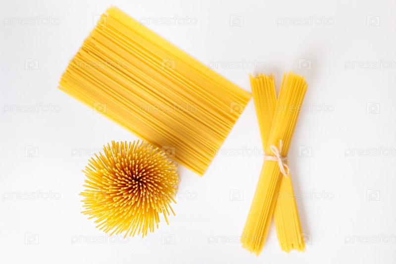 Вертикальный пучок и куча сырых спагетти, перевязанных ниткой. Связка на белом фоне. Вид сверху. Концепция итальянской кухни