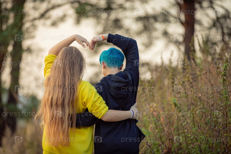 Две подружки идут по лесу, подняв руки над головой в виде сердца. Девушка с голубыми волосами