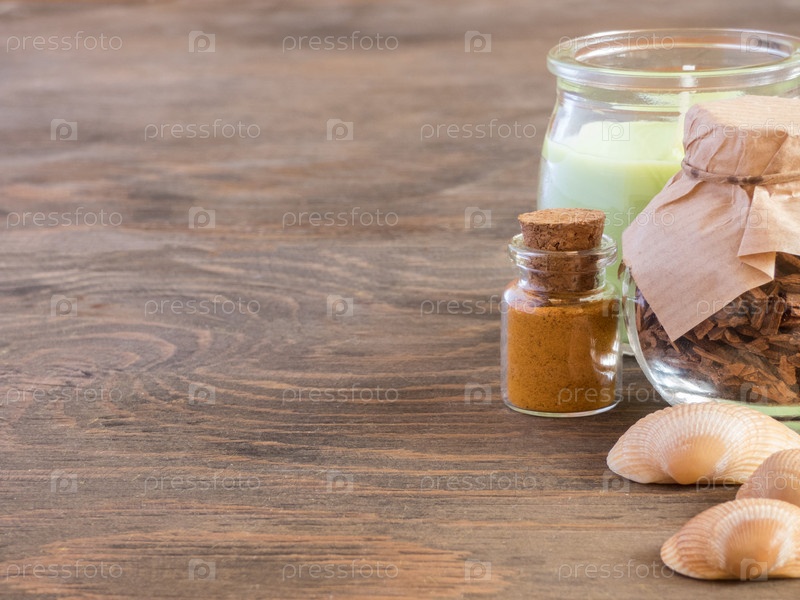 Набор ингредиентов и специй для ароматерапии и ухода за телом на деревянной поверхности. СПА натюрморт