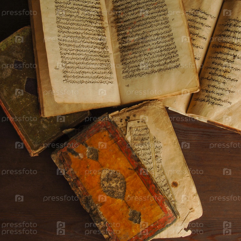 Стопка открытых древних книг на арабском языке. Старые арабские рукописи и тексты. Вид сверху
