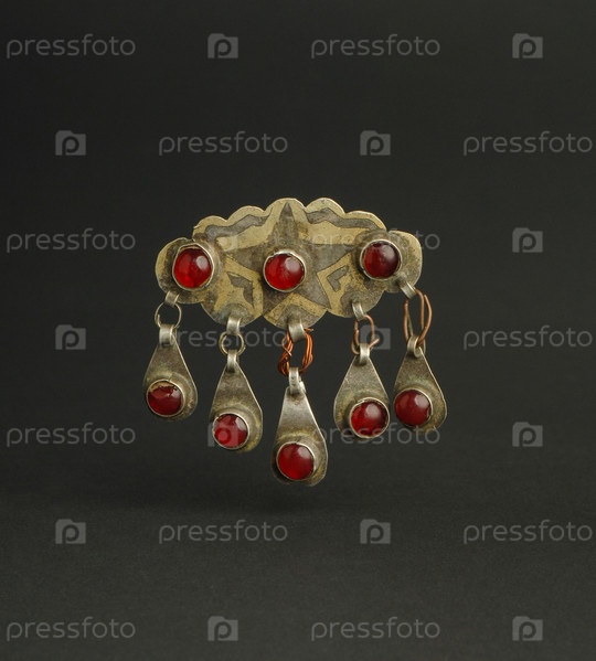 Старинная антикварная брошь с камнями на черном фоне. Среднеазиатские винтажные украшения