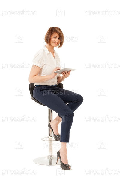 Портрет взрослой женщины с планшетом, смотрящей в камеру