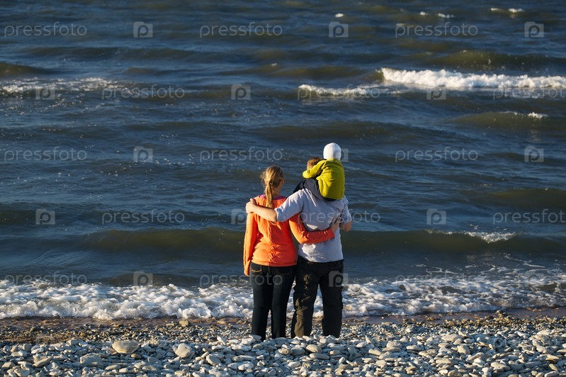 Молодая семья наслаждается днем на берегу моря