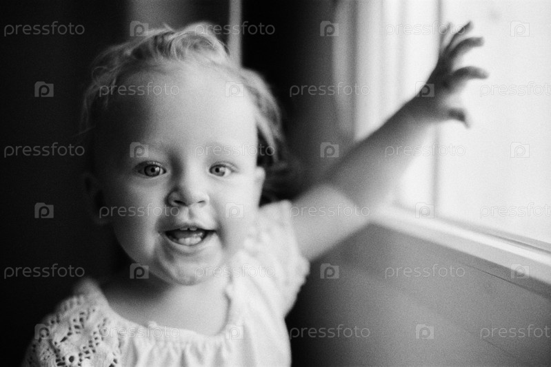 Портрет счастливой годовалой девочки в черно-белом