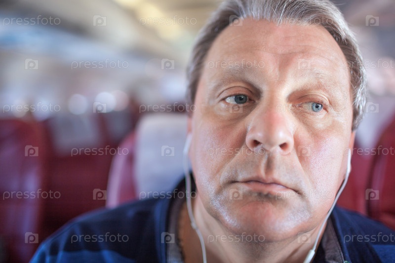 Мужчина слушает музыку в самолете