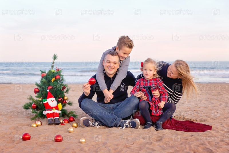 Рождественский портрет счастливой семьи на пляже