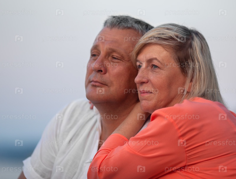 Пара средних лет сидит близко друг к другу и смотрит вдаль, улыбаясь