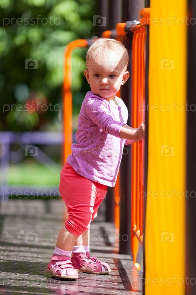 Маленький младенец стоит на детской площадке