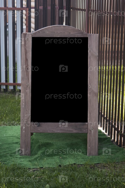 Пустая доска с деревянной рамой на открытом воздухе, стоящая на тротуаре. Шаблон макета меню