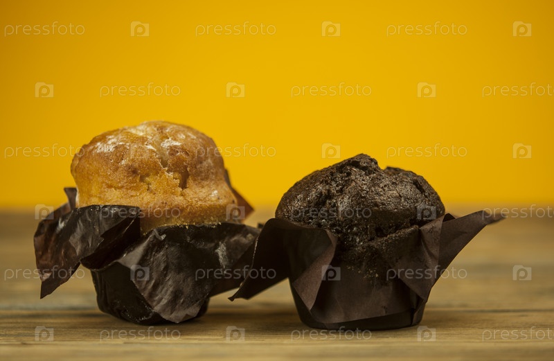 Домашние шоколадно-ванильные кексы на деревянном столе, посыпанные сахарной пудрой