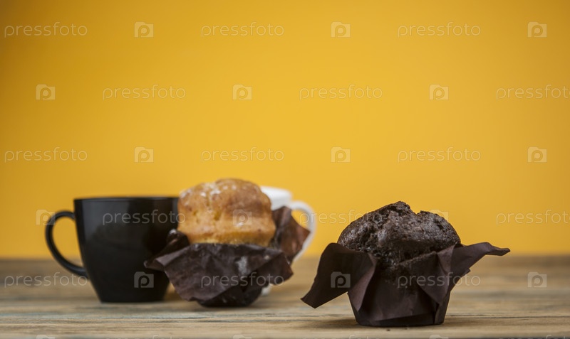 Домашние шоколадно-ванильные кексы на деревянном столе, посыпанные сахарной пудрой