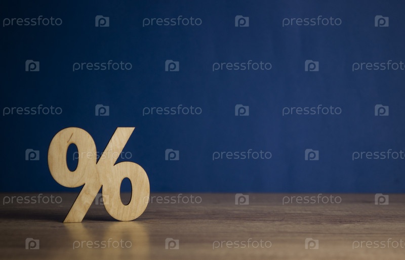 Значок символа знака процента деревянный на деревянном столе на синем фоне стены