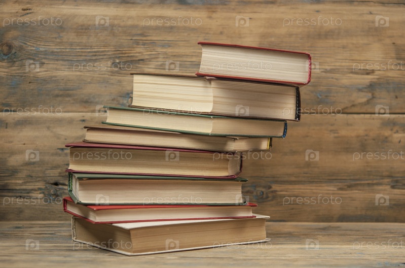 Стопка книг на деревянном столе на деревенском фоне с копией пространства