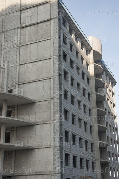 Строящийся городской дом. Недостроенный многоэтажный дом. Непокрытый фасад здания. Бетонная конструкция является основой для многоквартирного дома