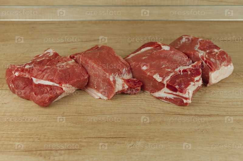 Кусок сырой свиной шеи на деревянном столе. крупный план, пространство для копирования