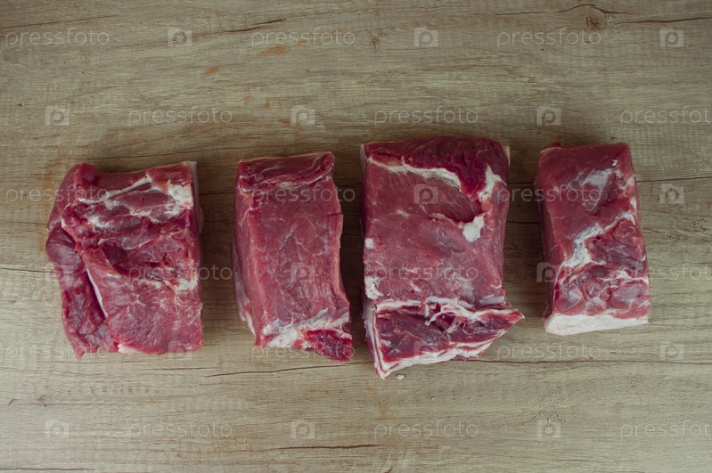 Кусок сырой свиной шеи на деревянном столе. крупный план, пространство для копирования