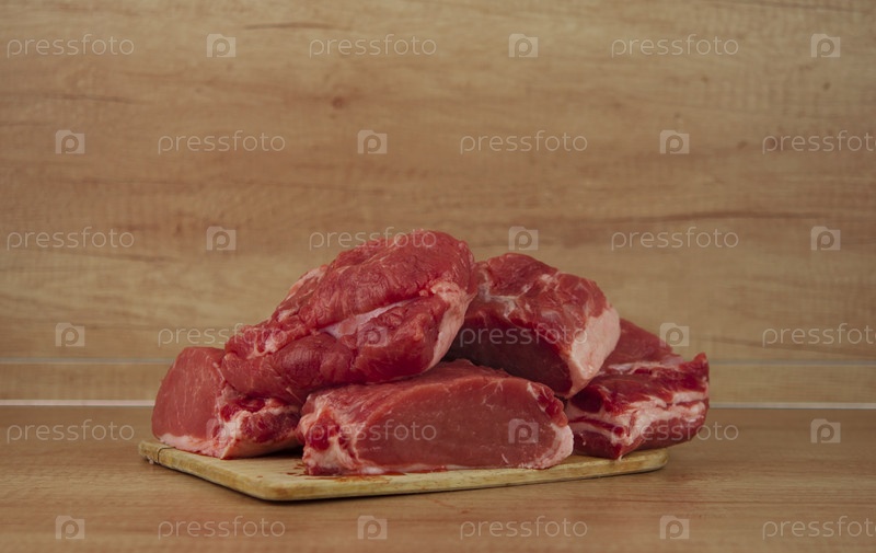 Кусок сырой свиной шеи на деревянном столе. крупный план, пространство для копирования