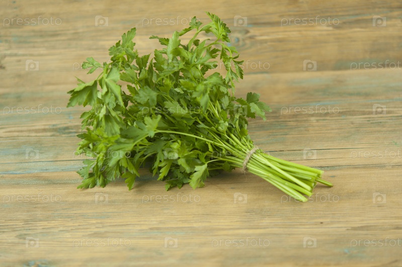 Свежий пучок зеленой петрушки на деревянном фоне. Вид сверху, плоская планировка. Элемент цветочного дизайна. Концепция здорового питания и диеты