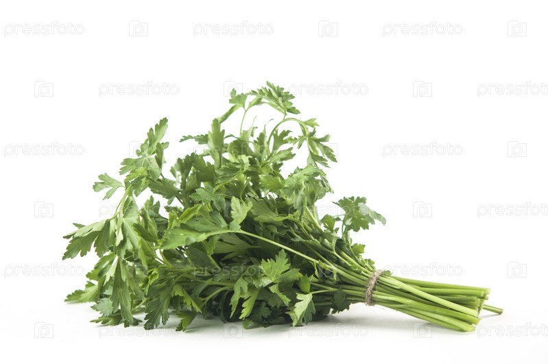 Свежий пучок зеленой петрушки на белом фоне. Вид сверху, плоская планировка. Элемент цветочного дизайна. Концепция здорового питания и диеты