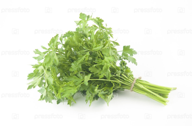 Свежий пучок зеленой петрушки на белом фоне. Вид сверху, плоская планировка. Элемент цветочного дизайна. Концепция здорового питания и диеты