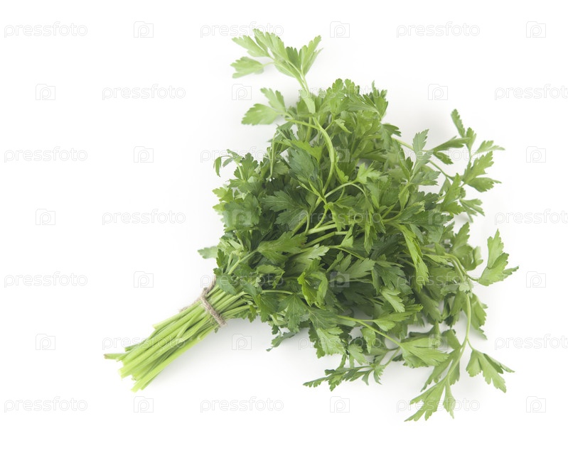 Свежий пучок зеленой петрушки на белом фоне. Вид сверху, плоская планировка. Элемент цветочного дизайна. Концепция здорового питания и диеты