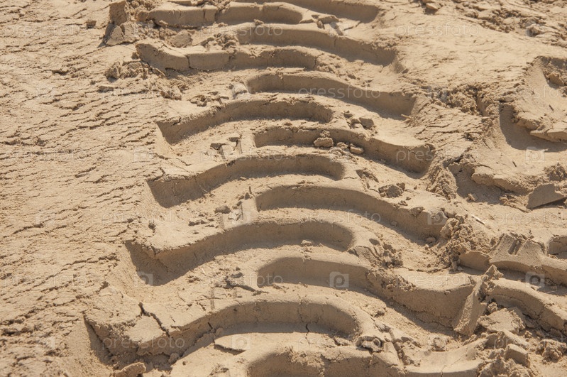 След трактора или грузовика на песке в охристых тонах, след автомобиля на грязи или грязи, большой след шины на асфальте