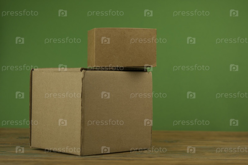 Коробка для посылок на деревянном столе, на красочном фоне