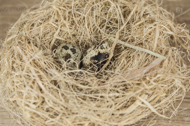 Перепелиные яйца в соломенном гнезде на кухонном столе