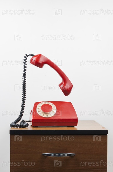 Красный ретро-телефон на деревянной тумбочке