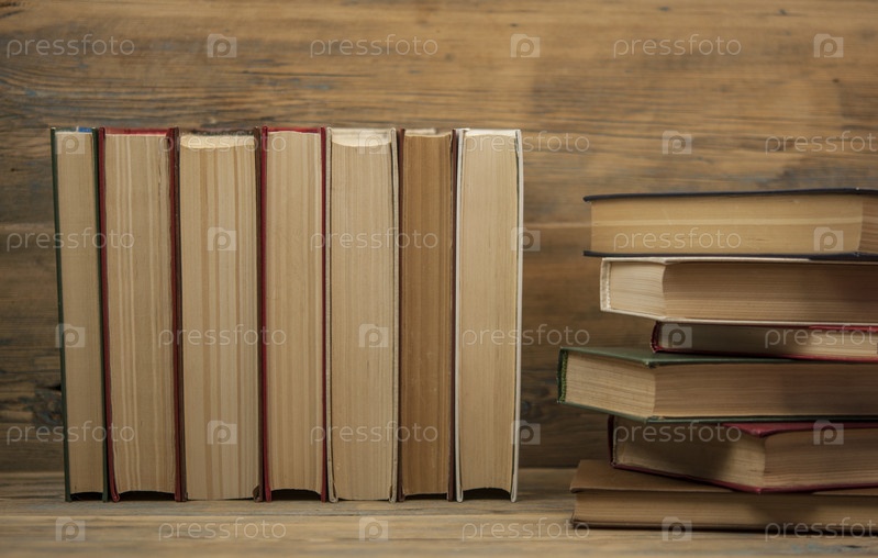 Стопка книг на деревянном столе на деревенском фоне с копией пространства