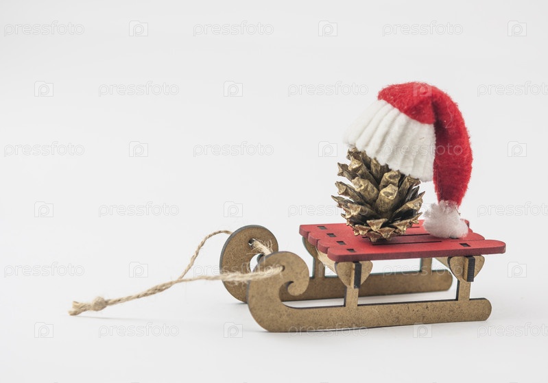 Сани и еловая шишка в шляпе Санты на белом с копией пространства