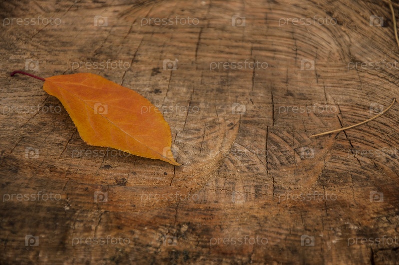 Желтый лист в лесу на темном пне. символ осеннего сезона. Концепция осеннего времени. плоская кладка. копировать пространство