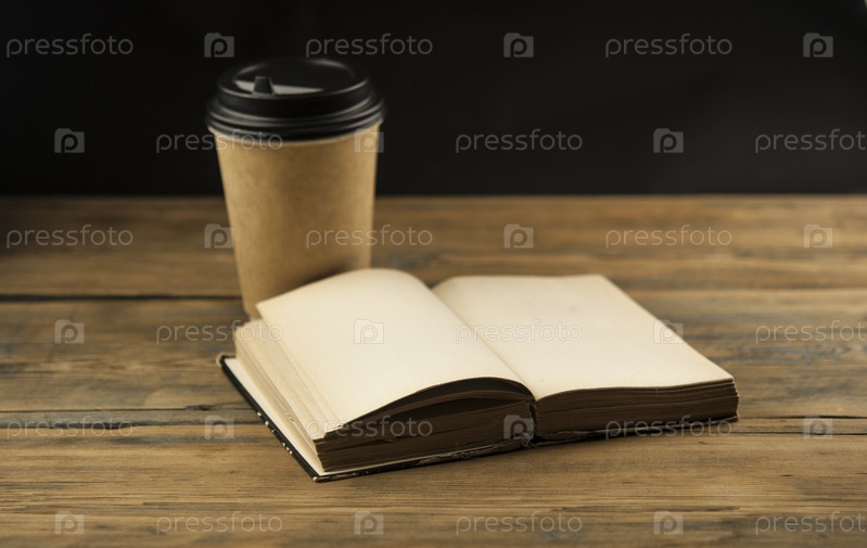 Открытая книга и чашка кофе в одноразовом бумажном стаканчике на деревянном столе