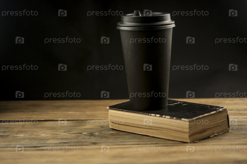 Старая книга и чашка кофе в одноразовом бумажном стаканчике на деревянном столе