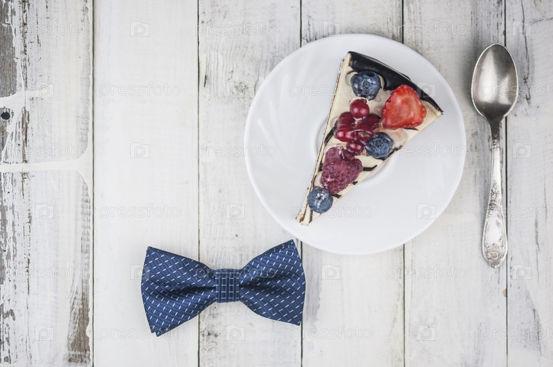 Смешайте ягодный торт на белой тарелке с бабочкой на деревянном фоне С Днем отца