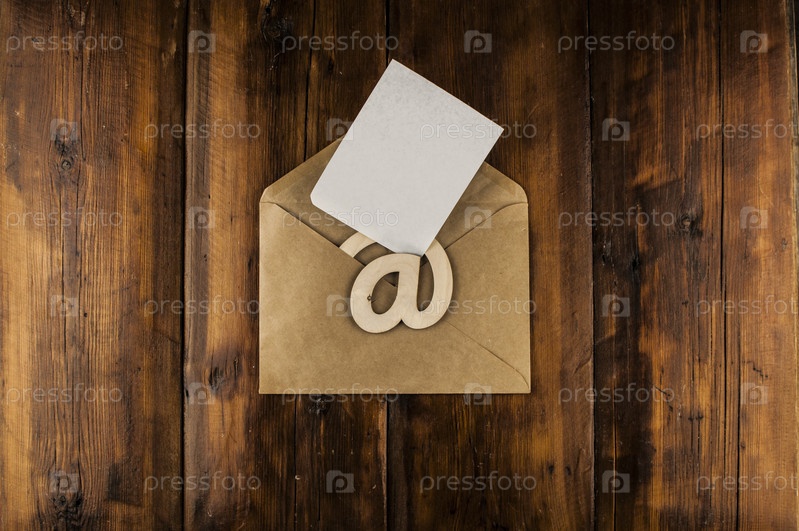 Знак электронной почты с белым чистым листом бумаги на ремесленном конверте лежит на старинном деревянном столе. Концептуальное письмо по электронной почте. Вид сверху с копией пространства