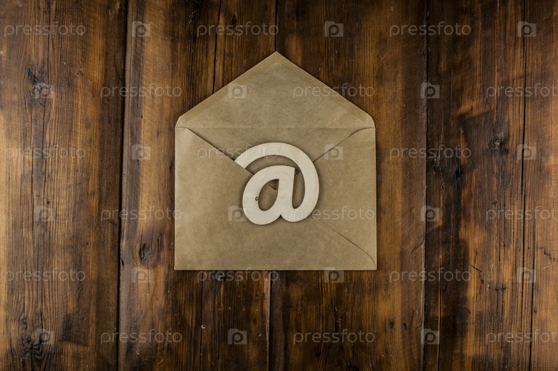 Знак электронной почты на ремесленном конверте лежит на старинном деревянном столе. Концептуальное письмо по электронной почте
