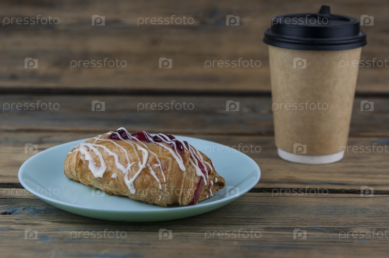 На столе из натуральных деревянных досок стоит керамическая тарелка с булочкой с черешней. Завтрак