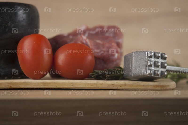 Большой кусок свинины с мясным молотком и две веточки розмарина на деревянном столе. Ингредиенты для приготовления мясных блюд