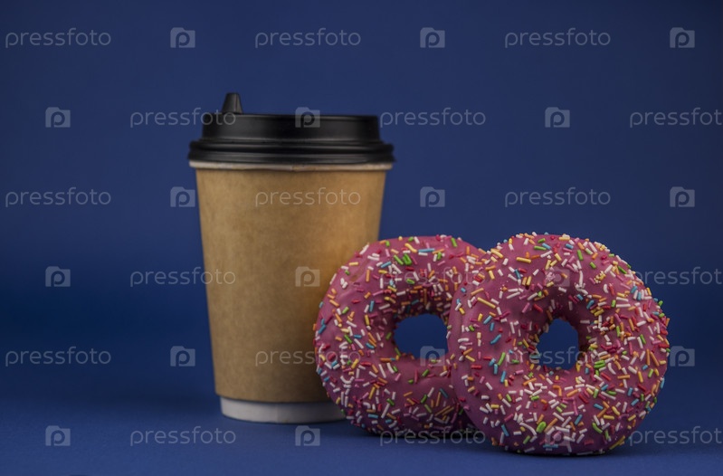Красочные пончики и одноразовая чашка кофе на синем фоне. Фото сладостей. Скопируйте пространство. Макет