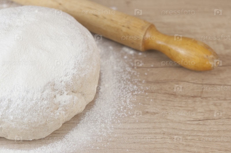 Домашнее тесто для пиццы со скалкой на деревянном столе