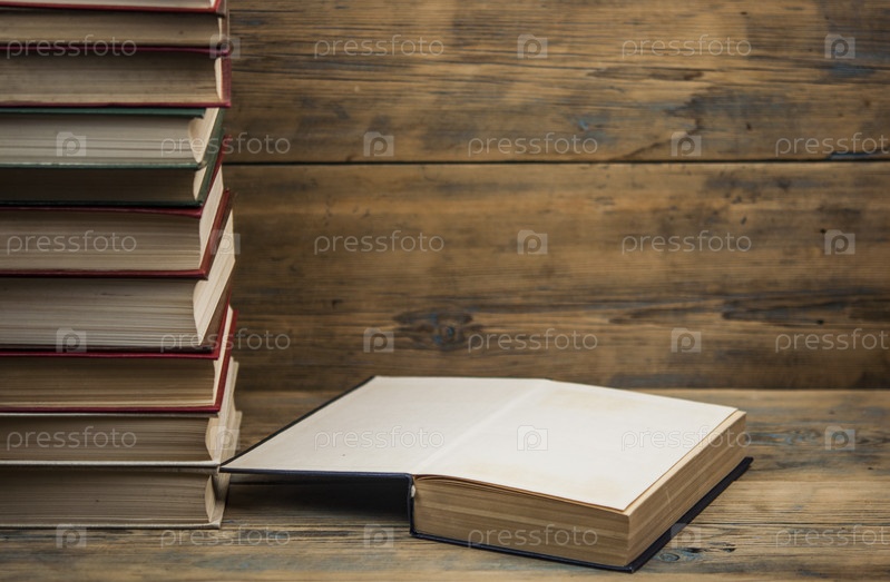 Стопка книг на деревянном столе на деревенском фоне с копией пространства