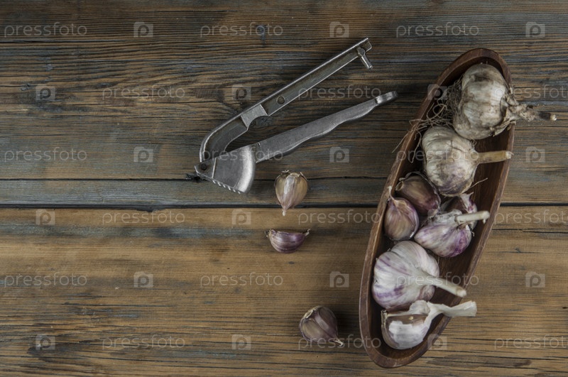 Органический чеснок с металлическим прессом. Свежие зубчики чеснока и луковица чеснока на деревянном столе. Чеснок для здорового питания. Концепция специй для здорового приготовления пищи. Крупный план