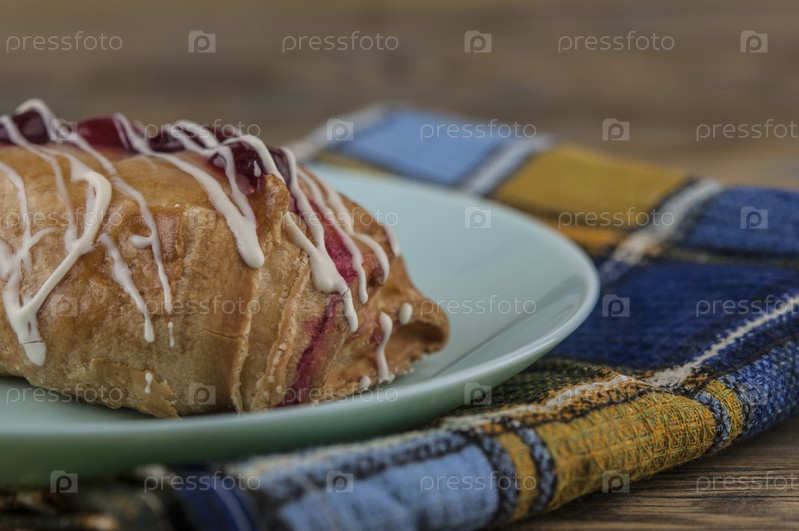 На столе из натуральных деревянных досок стоит керамическая тарелка с булочкой с черешней. Завтрак