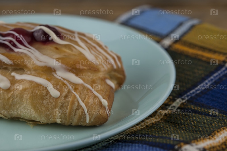 На столе из натуральных деревянных досок стоит керамическая тарелка с булочкой с черешней. Завтрак