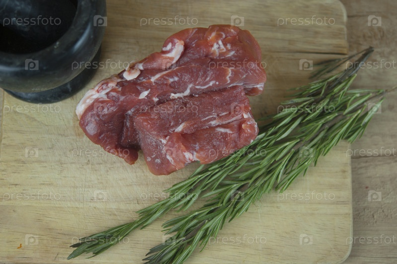 Большой кусок свинины и две веточки розмарина на деревянном столе. Ингредиенты для приготовления мясных блюд