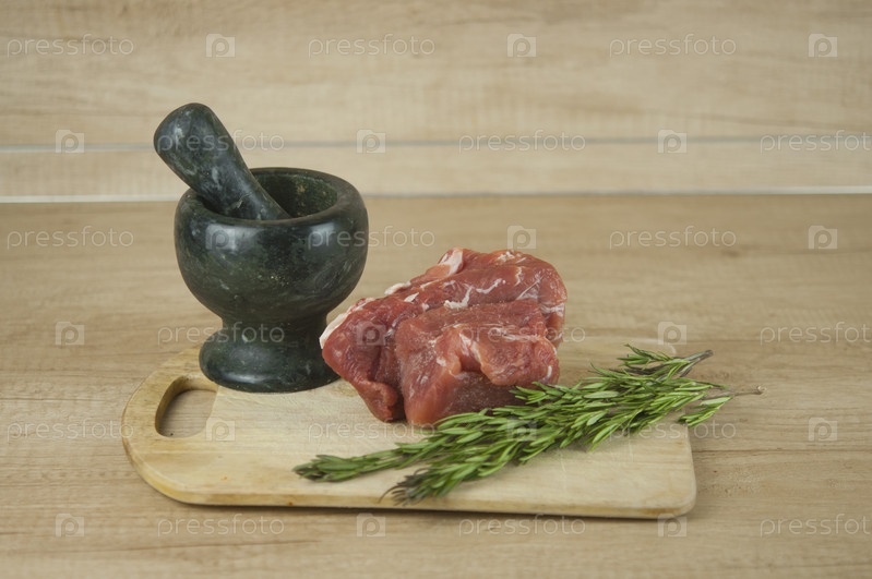 Большой кусок свинины и две веточки розмарина на деревянном столе. Ингредиенты для приготовления мясных блюд