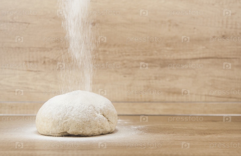 Шарик теста для пиццы на деревянном фоне с присыпкой мукой